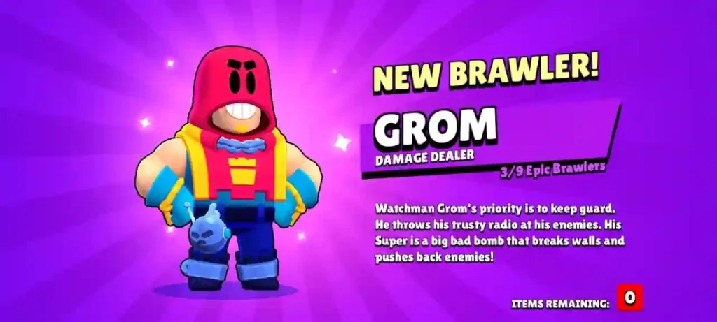 Grom es un brawler de rareza épica especializado en daño a distancia y control de área. Su ataque principal atraviesa obstáculos, lo que lo convierte en una amenaza constante en mapas con muros cerrados. Es ideal para modos como Atrapa Gemas, Caza Estelar y Knockout, donde mantener el control del terreno es esencial.